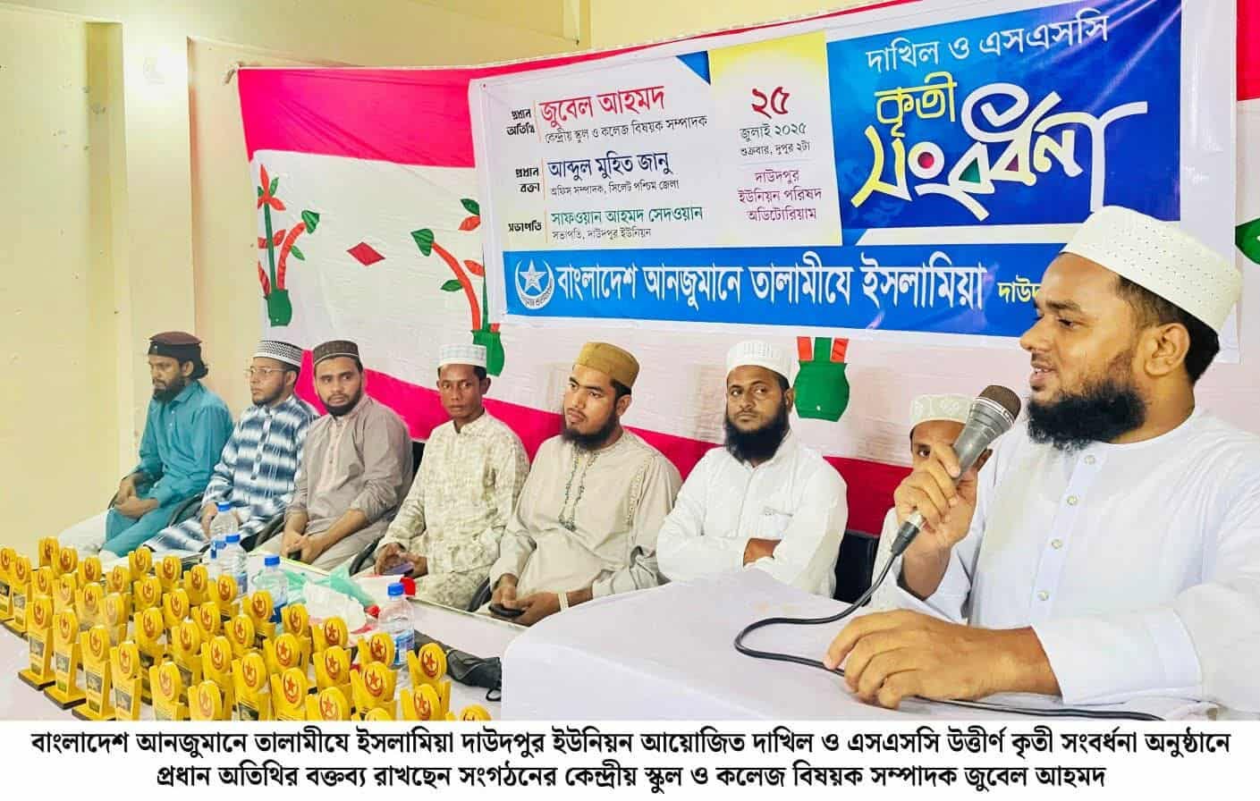 বাংলাদেশ আনজুমানে তালামীযে ইসলামিয়ার কেন্দ্রীয় স্কুল ও কলেজ বিষয়ক সম্পাদক জুবেল আহমদ বলেন, জীবনে সফল হতে হলে আমাদের আগে একটি সুনির্দিষ্ট লক্ষ্য নির্ধারণ করতে হবে। কারণ যে মানুষ জানে না সে কোথায় যাবে, সে কোনোদিনই ঠিক গন্তব্যে পৌঁছাতে পারে না। তবে কেবল লক্ষ্য থাকলেই হবে না। সেই লক্ষ্যে পৌঁছানোর জন্য প্রয়োজন হয় সাহস, পরিশ্রম এবং ধৈর্যের। পথচলায় ভুল হবে, বাধা আসবে, অনেক সময় মনে হবে থেমে যাই। কিন্তু সফলতার আসল রহস্য হলো হাল না ছাড়া। কারণ মাঝপথে থেমে গেলে কখনোই গন্তব্যে পৌঁছানো যায় না। এই চলার পথে আমাদের প্রয়োজন হয় বড়দের দুআ এবং অভিজ্ঞদের পরামর্শ। এসবই আমাদের আলোর পথ দেখায়, বিপদের সময় সঠিক সিদ্ধান্ত নিতে সাহায্য করে।আমরা মুসলমান। আমাদের জীবন কেবল এই দুনিয়াতেই সীমাবদ্ধ নয়। আমাদের লক্ষ্য হওয়া উচিত দুনিয়ার পাশাপাশি আখিরাতেও সফল হওয়া। তাই ইসলামি জ্ঞান, ধর্মীয় নৈতিকতা ও ঈমান আমাদের জীবনের ভিত্তি হওয়া উচিত। আপনার যদি ইসলামি মূল্যবোধ না থাকে, যদি ইমান না থাকে, যদি ধর্মীয় জ্ঞান না থাকে তবে আপনি শুধু এক খোলস, যার ভেতরে কোনো আত্মা নেই। সফলতা মানে কেবল অর্থ-বিত্ত নয় বরং আত্মিক শান্তি, সঠিক পথ ও পরকালের মুক্তিই হচ্ছে প্রকৃত সফলতা।বাংলাদেশ আনজুমানে তালামীযে ইসলামিয়া দাউদপুর ইউনিয়ন আয়োজিত দাখিল ও এসএসসি উত্তীর্ণ কৃতী সংবর্ধনা অনুষ্ঠানে প্রধান অতিথির বক্তব্যে তিনি এসব কথা বলেন। ২৫ জুলাই ২০২৫, শুক্রবার, দুপুর ২টায় দাউদপুর ইউনিয়ন পরিষদ অডিটোরিয়ামে এ সংবর্ধনা অনুষ্ঠিত হয়।