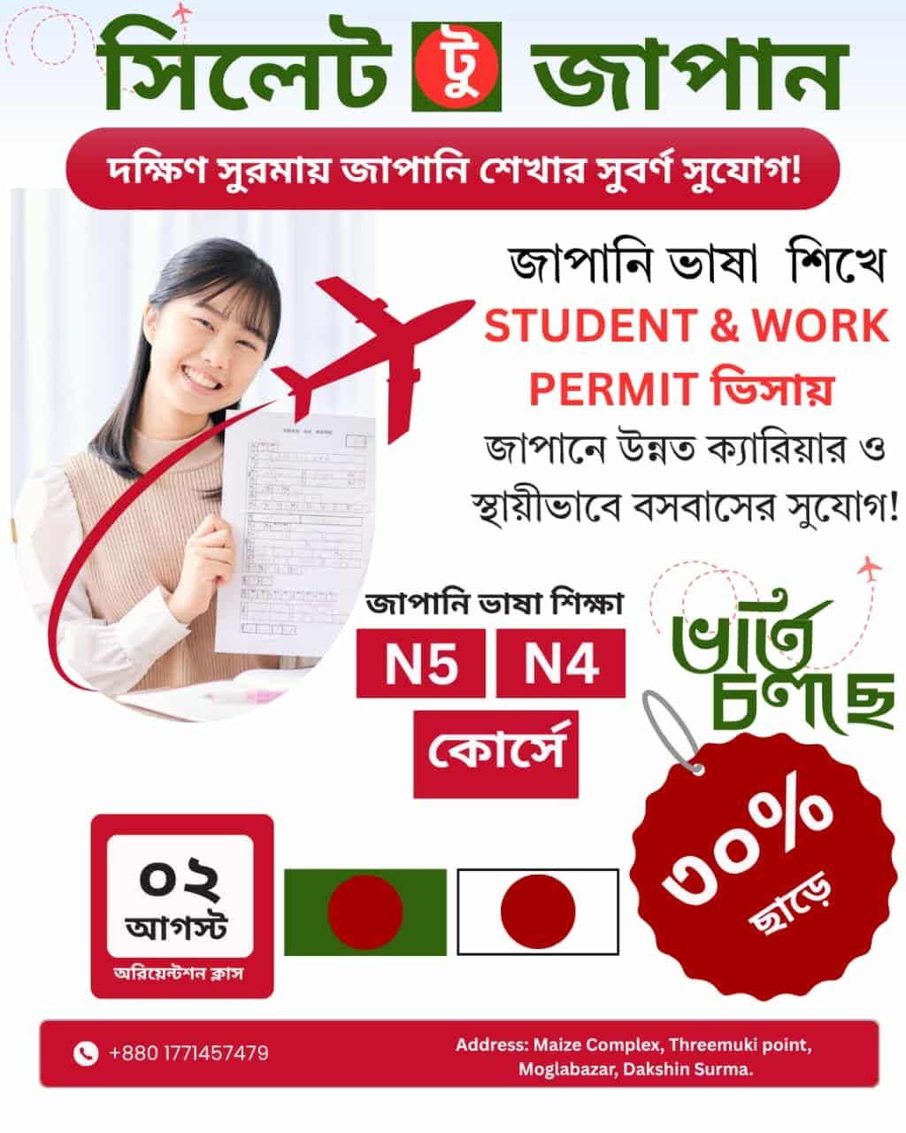 জাপানে ১ লক্ষ কর্মী নেবে! আপনি কি প্রস্তুত জাপানি ভাষা শিখে স্টুডেন্ট ও জব ভিসায় জাপান যান এখনই সম্প্রতি অধ্যাপক ড. মুহাম্মদ ইউনূস স্যারের জাপান সফর থেকে এসে বলেন বাংলাদেশ থেকে ১ লক্ষ দক্ষ কর্মী নেওয়ার ঘোষণা দিয়েছে এখনই সময় জাপানি ভাষা শেখার জাপানে পড়াশোনা, চাকরি কিংবা স্থায়ীভাবে বসবাস করতে চাইলে JLPT N5 & N4 কোর্সে ভর্তি হন আজই ফ্রি অরিয়েন্টেশন ক্লাস শুরু: ২ আগস্ট ২০২৫ (Saturday) সময় সকাল ও বিকাল ব্যাচ (দুই সময়েই ক্লাস) কোর্স: JLPT N5 & N4 বিশেষায়িত প্রশিক্ষক ও বাস্তবভিত্তিক শিক্ষাদান পদ্ধতি জাপানি ভাষা শেখার ৫টি বড় কারণ জাপানে স্টুডেন্ট ভিসা জাপানে চাকরির সুযোগ (TITP / SSW ভিসা) ইন্টারন্যাশনাল জব ভিসা বাংলাদেশে জাপানি কোম্পানিতে কাজ শিক্ষকতা – ভাষা ইনস্টিটিউটে ভর্তির জন্য প্রয়োজনীয় কাগজপত্র: NID/জন্ম নিবন্ধনের ফটোকপি ২ কপি পাসপোর্ট সাইজ ছবি কোর্স ফি জানতে যোগাযোগ করুন।Threemuki Point, Moglabaza যোগাযোগ: 01771457479 ENFOREX Human Resource Development Training Center