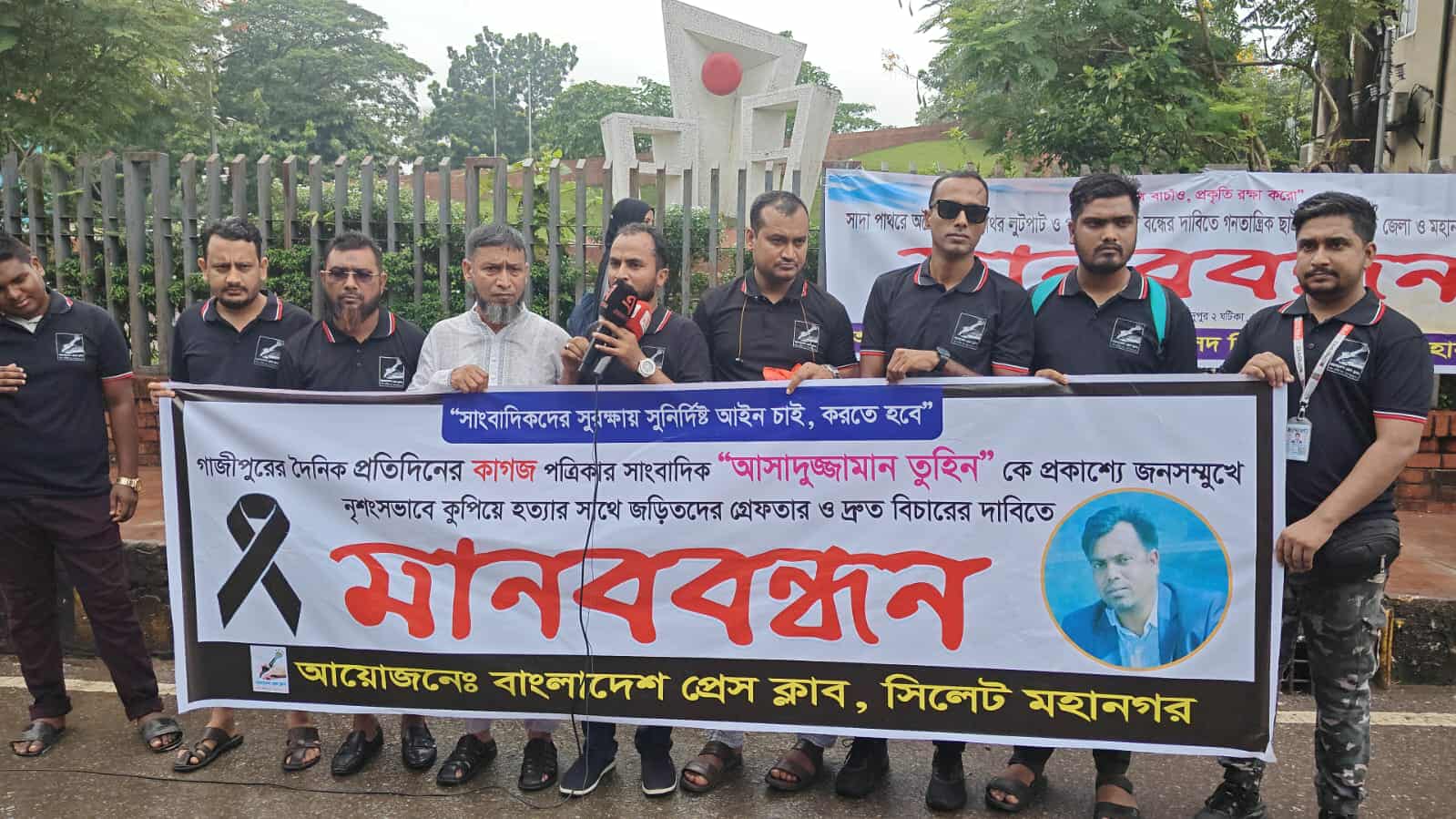 ঢাকা গাজীপুর সাংবাদিক আসাদুজ্জামান তুহিন হত্যার আটক কৃত হত্যাকারীদের দ্রুত বিচারের দাবীতে সিলেটে বাংলাদেশ প্রেসক্লাব সিলেট মহানগর শাখার উদ্যোগে সাংবাদিক ও সুশীল সমাজের গণ্যমান্য ব্যক্তিবর্গরা মানববন্ধন অনুষ্ঠিত করেন। ১২ই আগষ্ট রোজ মঙ্গলবার দুপুর ২,০০ঘটিকার সময় সিলেট কেন্দ্রীয় শহীদ মিনারের সামনে এই মানববন্ধন অনুষ্ঠিত হয়। বাংলাদেশ প্রেসক্লাব সিলেট মহানগরের সভাপতি আমিনুল হকের সভাপতিত্বে ও সাংবাদিক রাজন আহমদের সন্চালনায় স্বাগত্ব বক্তব্য রাখেন সাংবাদিক আশরাফুল ইসলাম বিশেষ অতিথির বক্তব্য রাখেন সাংবাদিক শেখ ফয়ছল জামিল, সাংবাদিক মোঃ শরীফ আহমদ সম্পাদক দৈনিক হলি স্পিচ টিভি. কম,দৈনিক আলোর জগৎ পত্রিকার ব্যুরোচীফ সাংবাদিক ছালিক আহমদ, সাংবাদিক ইউনিয়ন সিলেট জেলার সাধারন সম্পাদক বিপ্লব পাল, প্রধান অতিথির বক্তব্য রাখেন সিলেট রেফারি এসোসিয়েশনের সাধারন সম্পাদক আব্দুল আজিম।